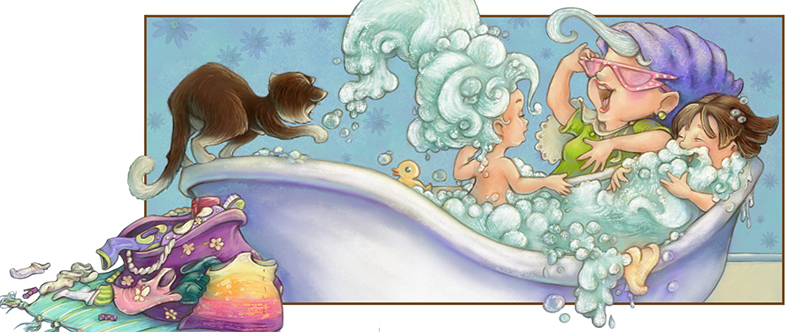 There's Tillie Vanilly with the bright pink hair, star of The Tillie Vanilly Show, who loves to tell jokes and dance the conga, Chef Silly Tillie with the lampshade hat, who offers up a dinner of Giggly Chili, and Madame Frilly Tillie with the sparkly eyeglasses and towel turban, the world's most creative bath-bubble stylist.